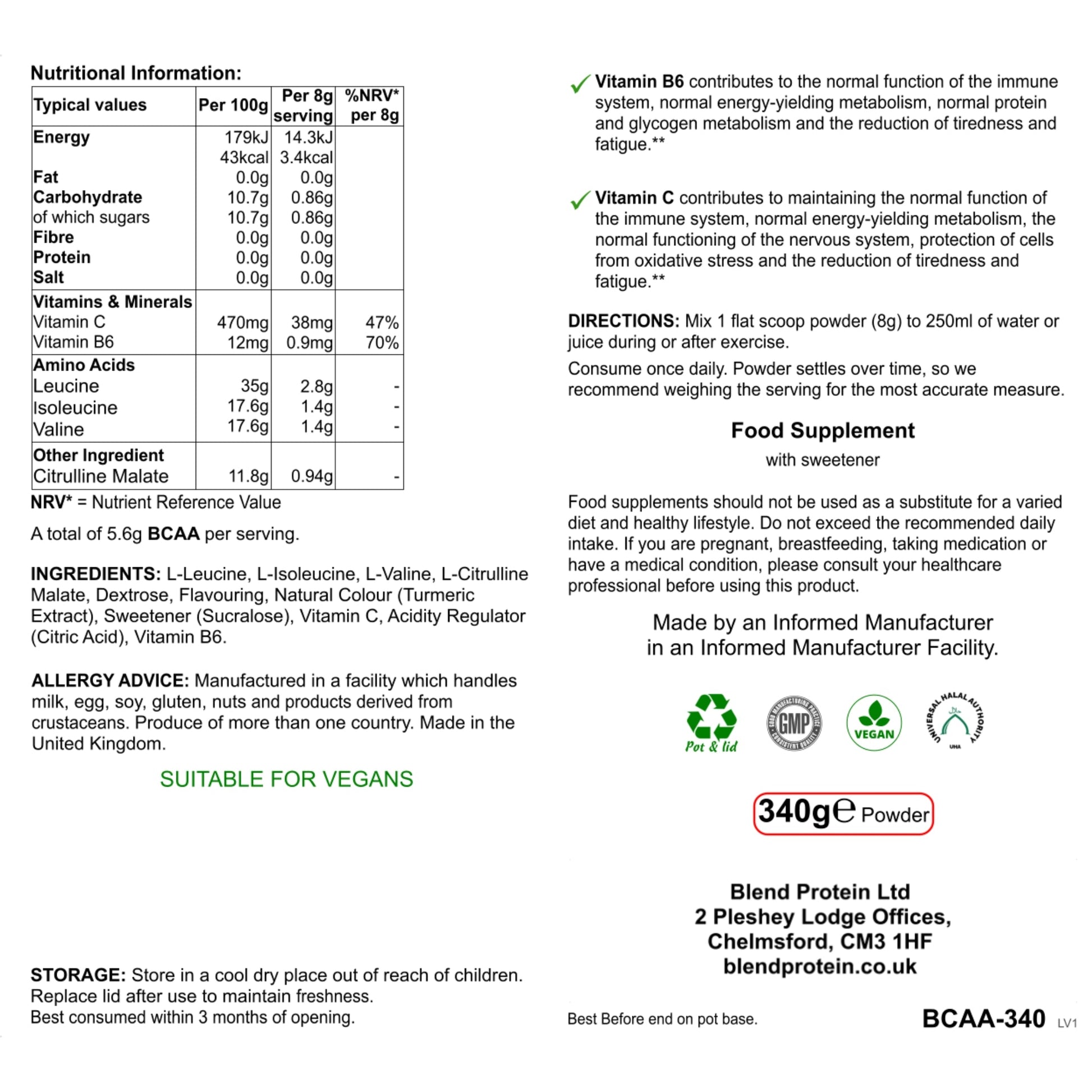 BCAA is a delicious lemon and lime flavour drink mix, which contains essential branched chain amino acids - leucine, isoleucine and valine.